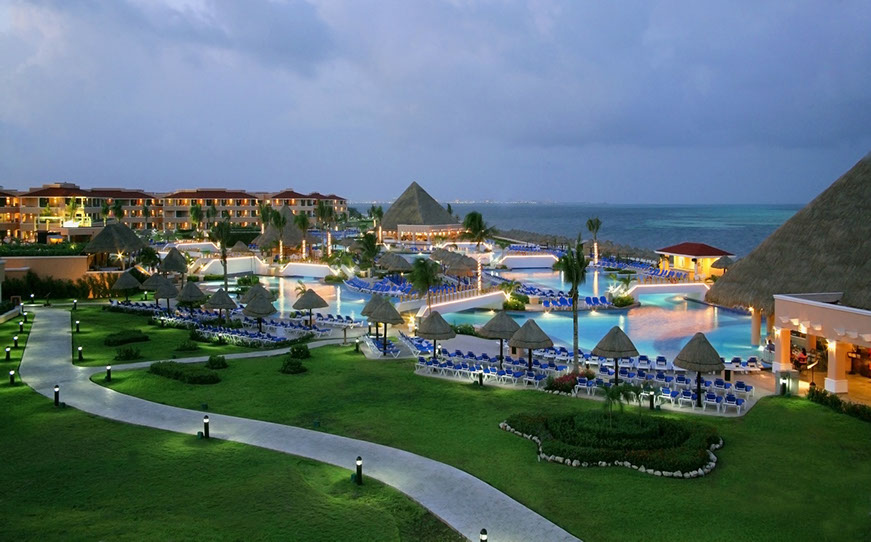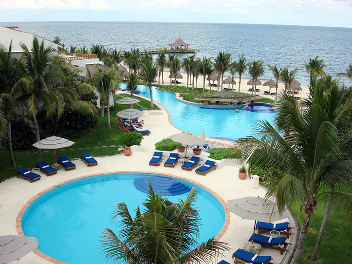 Lush green lawns back enormous swimming pools